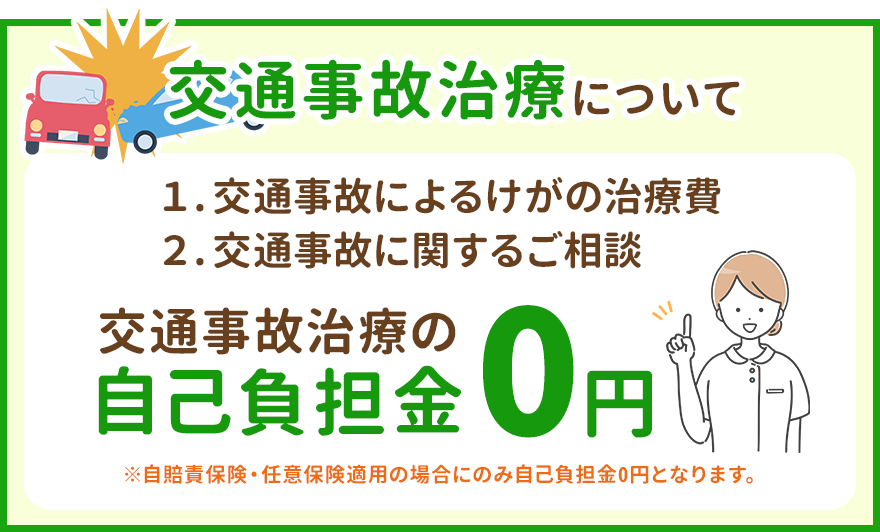 当院では交通事故の対応と治療を強化しており、事故に関するお悩みを解決できるように体制を整えております。